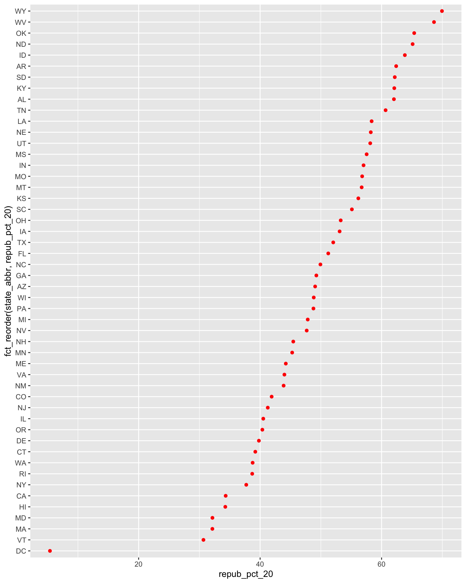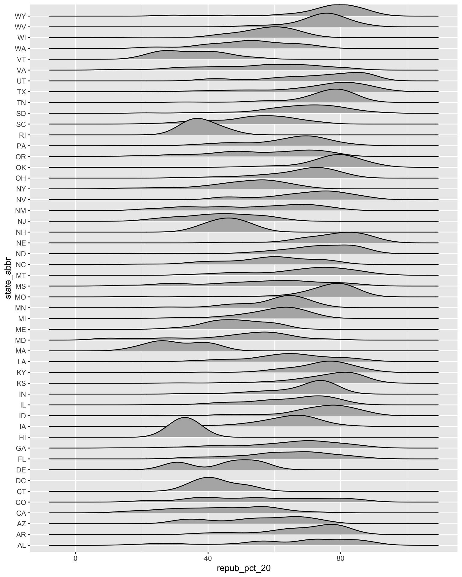 ggplot(elections, aes(x = repub_pct_20, y = fct_reorder(state_abbr, repub_pct_20), fill = historical)) +