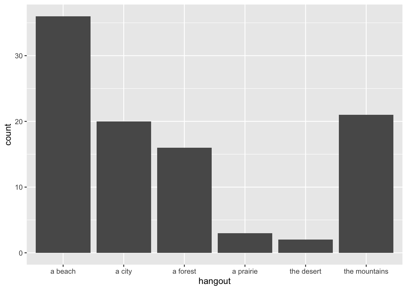Students were asked, in that moment, where they’d most like to spend time outside. How did they answer? Was there a lot of agreement or a lot of variability in answers? Build and interpret a plot that helps address these questions while reviewing: