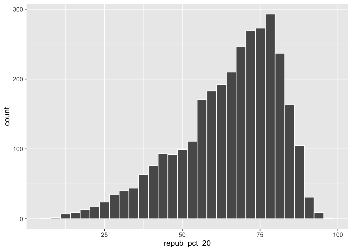 geom_histogram(color = "white")`stat_bin()` using `bins = 30`. Pick better value with `binwidth`.