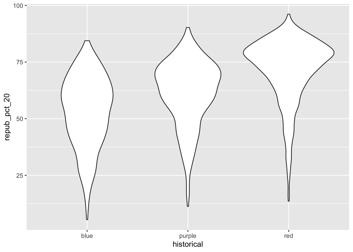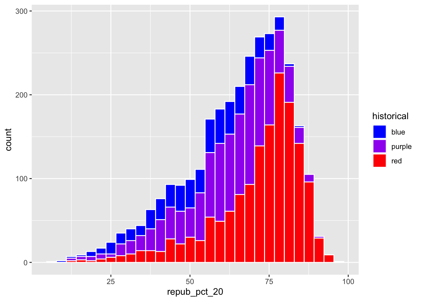 There’s quite a bit of range in county-level R support within blue, purple, and red states. However, R support tends to be higher in red states and lower in blue states.