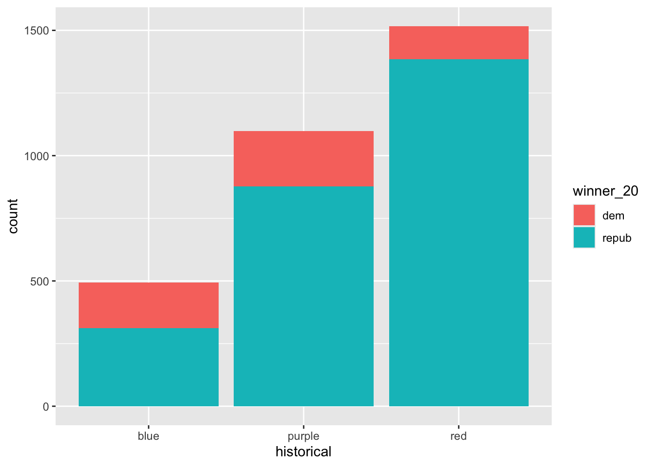 pro = easier to compare the relative outcomes in blue vs purple vs red states con = lose track of how many counties fall into blue vs purple vs red states