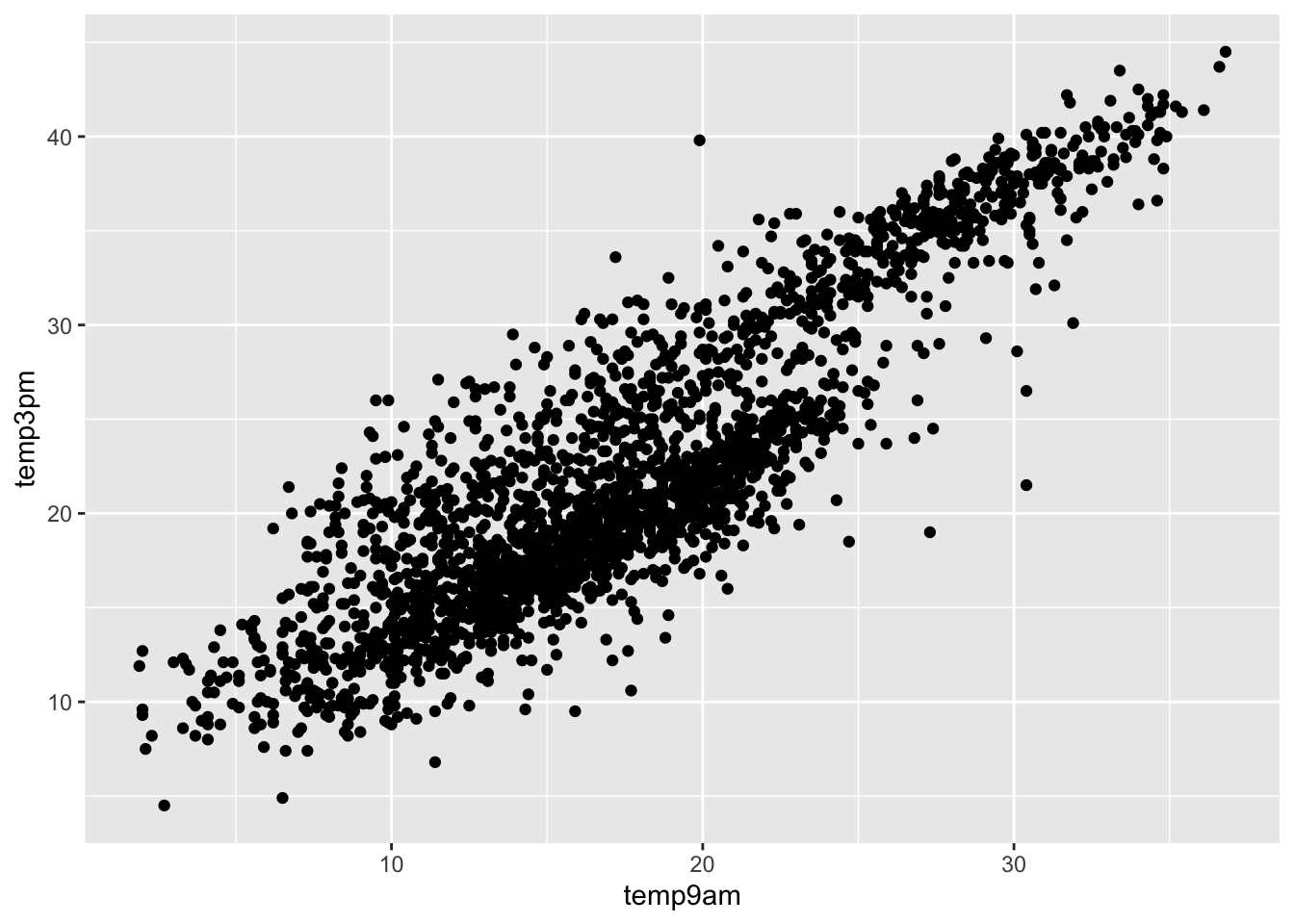ggplot(weather, aes(y = temp3pm, x = temp9am)) +