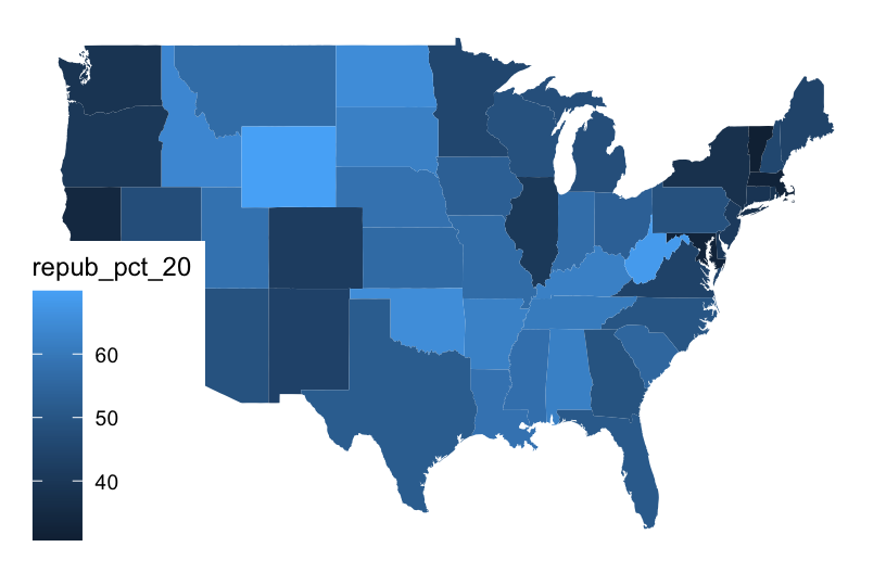 elections_by_counties <- read.csv("https://mac-stat.github.io/data/election_2020_county.csv")In these datasets, we’re interested in the overall election outcome by region (state or county), not the specific geographic location of some observation. Let’s wrangle our data first.