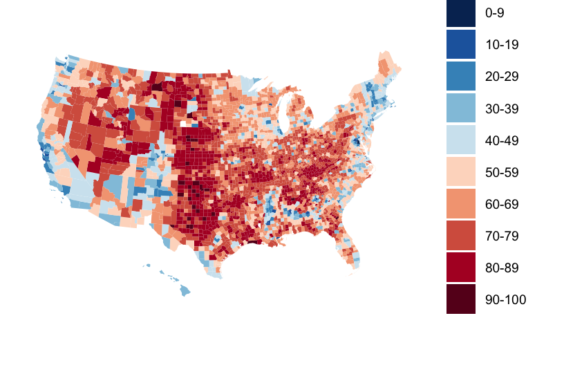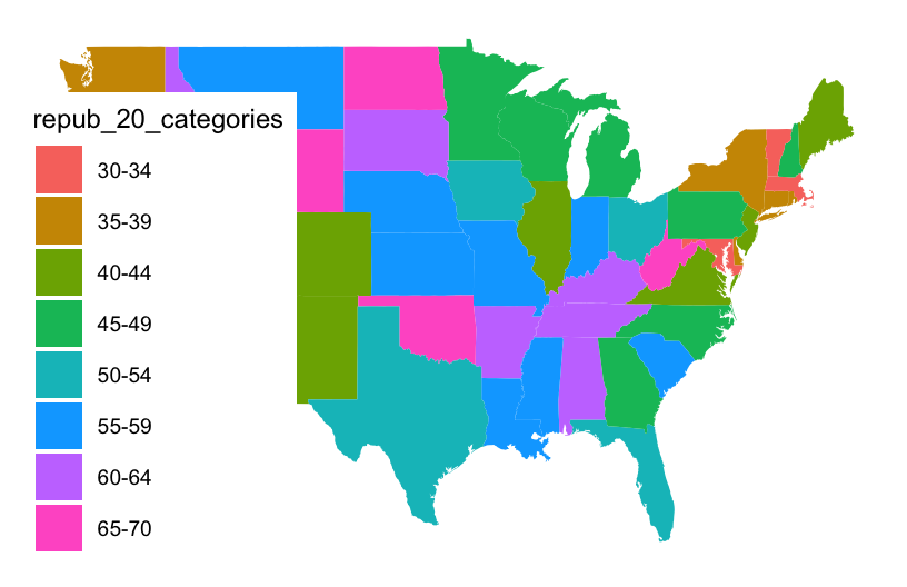 Now map Republican support by county. Let’s go straight to the discretized repub_20_categories variable, and a good color scale.