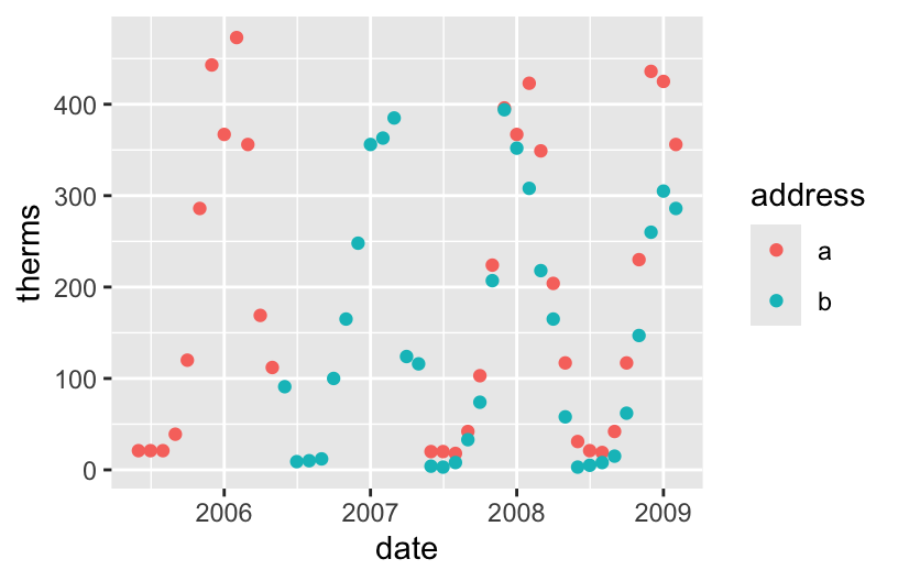 Both addresses used between 0 and 450 therms per month. There seem to be two types of months – those with lower use around 50 therms and those with higher use around 300/400 therms.