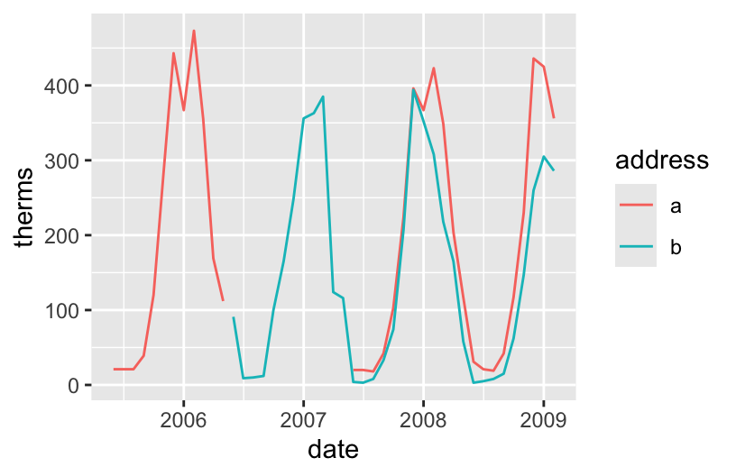 ggplot(energy, aes(y = therms, x = date, color = address)) +