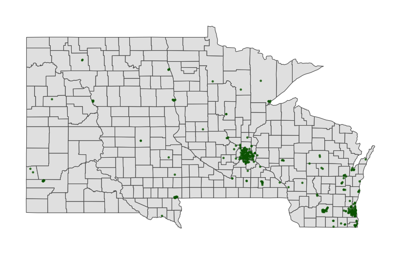 Where we grab this info can also depend upon the structure of our data and how much data wrangling / cleaning we’re up for. For choropleth maps, the labels of regions in our data must match those in the background map. For example, if our data labels states with their abbreviations (eg: MN) and the background map refers to them as full names in lower case (eg: minnesota), we have to wrangle our data so that it matches the background map.
