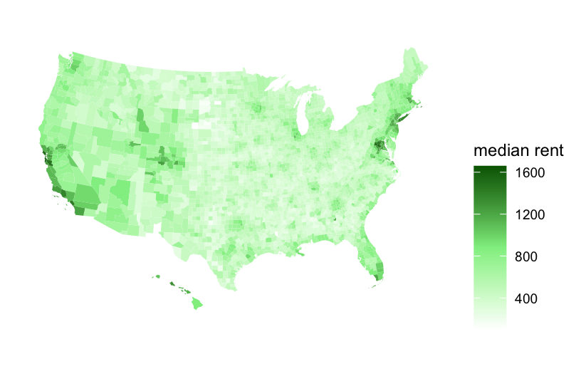 scale_fill_gradientn(name = "median rent", colors = c("white", "lightgreen", "darkgreen"))