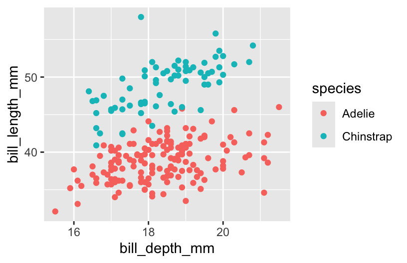 ## 2 Chinstrap 68# Create a dataset with just Adelie and Chinstrap using !=