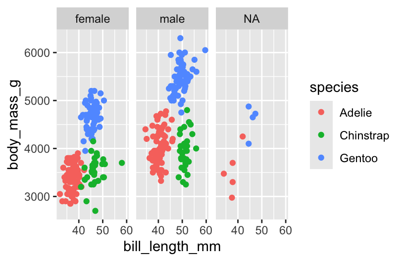 Construct a plot that allows us to examine how the relationship between body mass and bill length varies by species and sex.
