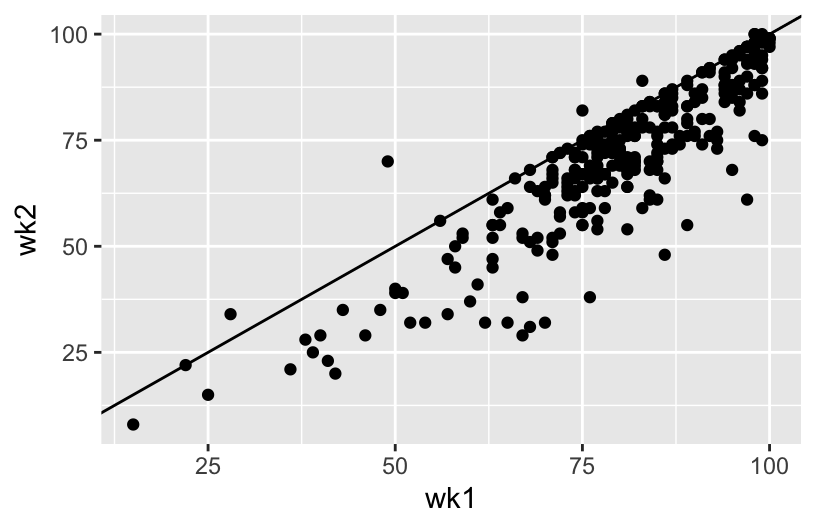 ggplot(billboard, aes(y = wk2, x = wk1)) +