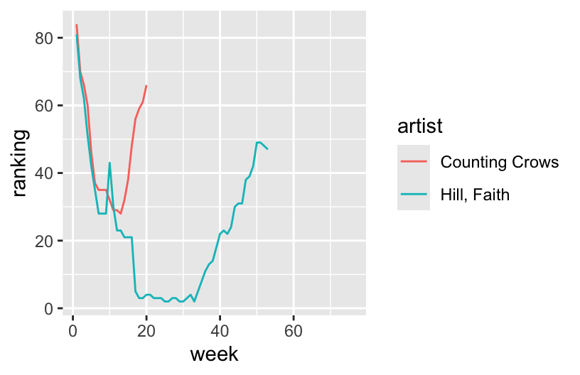 ggplot(aes(y = ranking, x = week, color = artist)) +