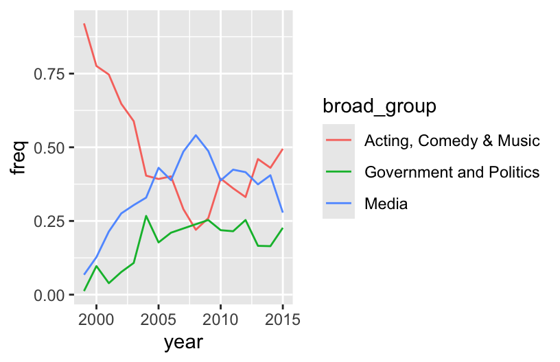 ggplot(aes(y = freq, x = year, color = broad_group)) +