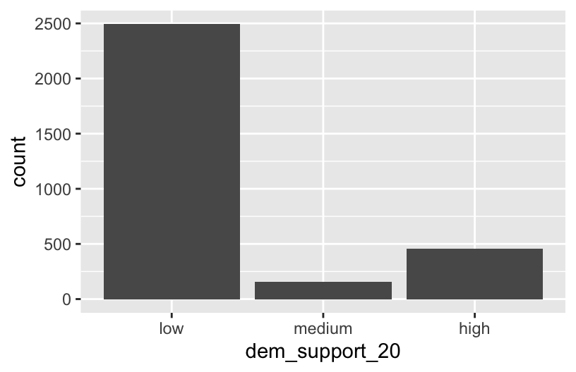 ## $ dem_support_20: Factor w/ 3 levels "low","medium",..: 1 1 1 1 1 3 1 1 1 1 ...# And plot dem_support_20