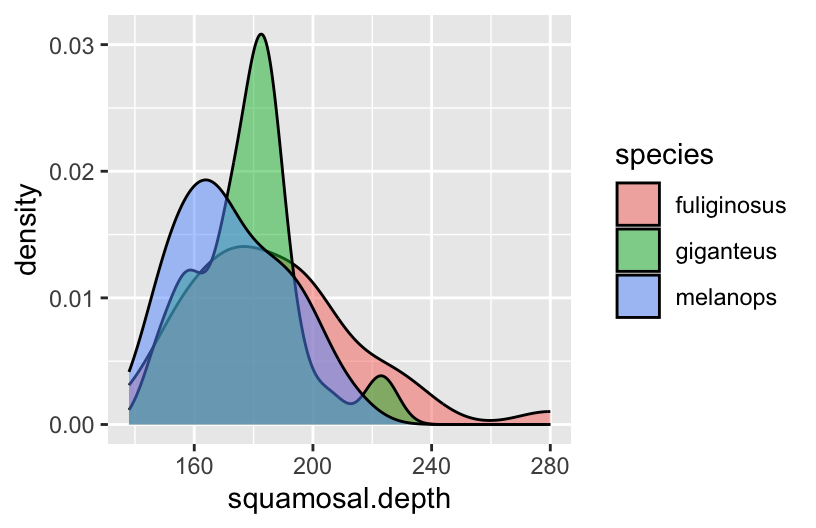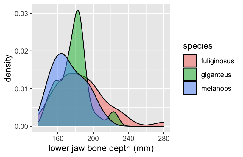 # Load data & packageslibrary(tidyverse)roos <-read.csv("https://ajohns24.github.io/data/kangaroos2.csv")# Plot lower jaw bone depthggplot(roos, aes(x = squamosal.depth, fill = species)) +geom_density(alpha =0.5)
