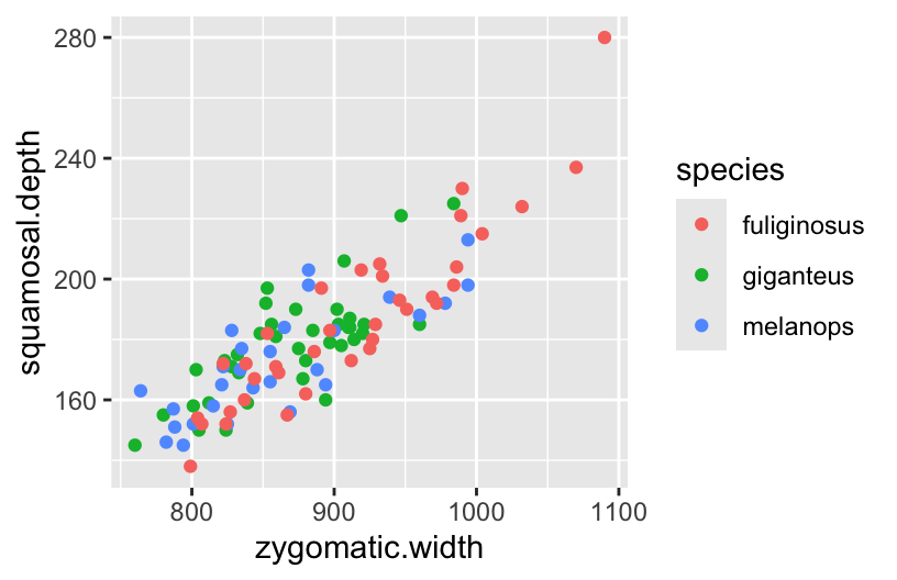 # Plot squamosal.depth vs zygomatic.widthggplot(roos, aes(y = squamosal.depth, x = zygomatic.width, color = species)) +geom_point()