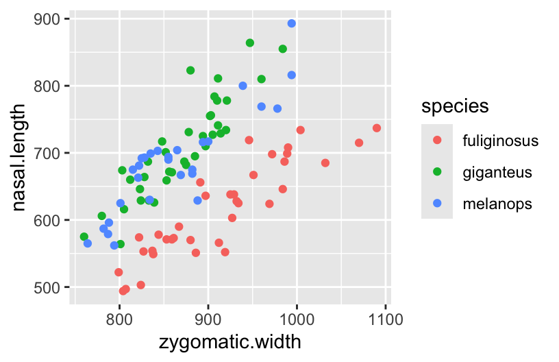 # Plot nasal length vs cheekbone widthggplot(roos, aes(y = nasal.length, x = zygomatic.width, color = species)) +geom_point()
