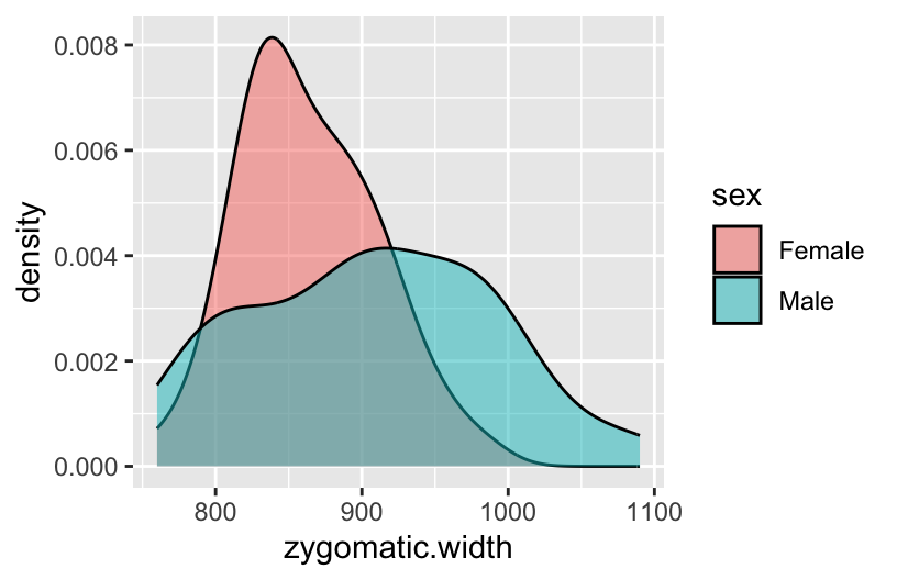 # Plot cheekbone width by sexggplot(roos, aes(x = zygomatic.width, fill = sex)) +geom_density(alpha =0.5)