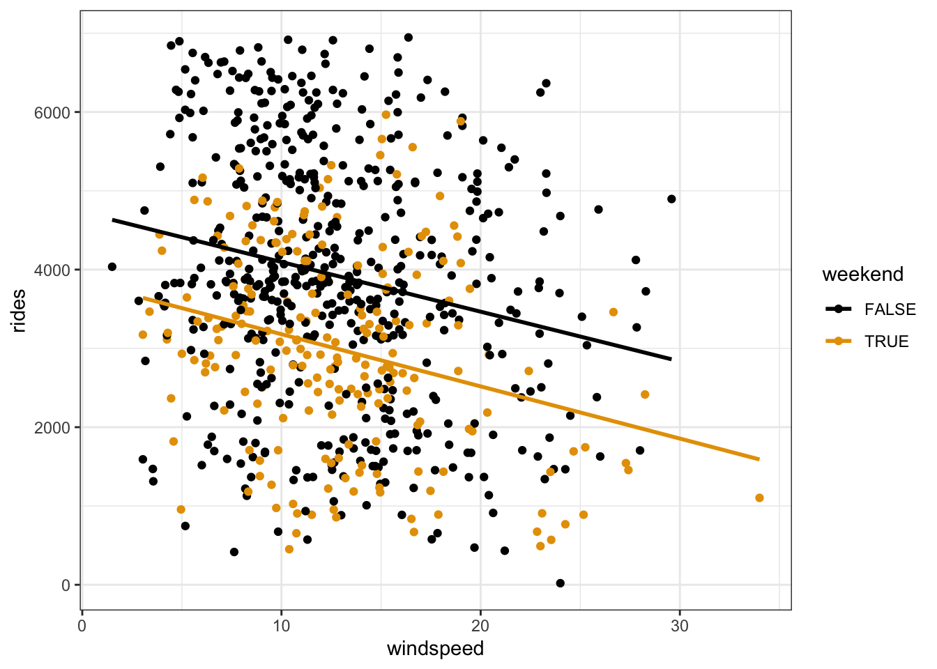 E[rides | windspeed, weekend] = \(\beta_0\) + \(\beta_1\) windspeed + \(\beta_2\) ___