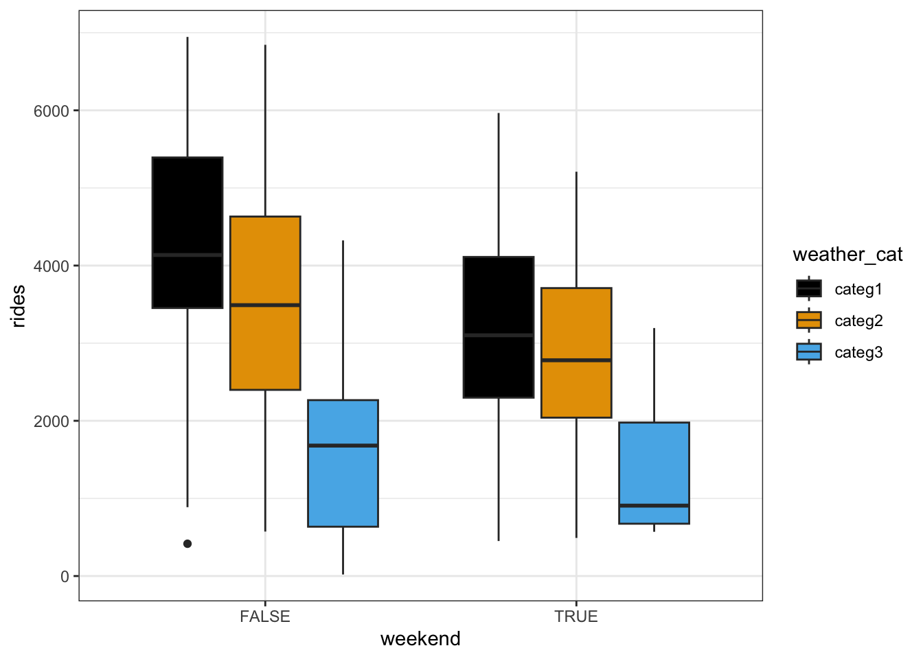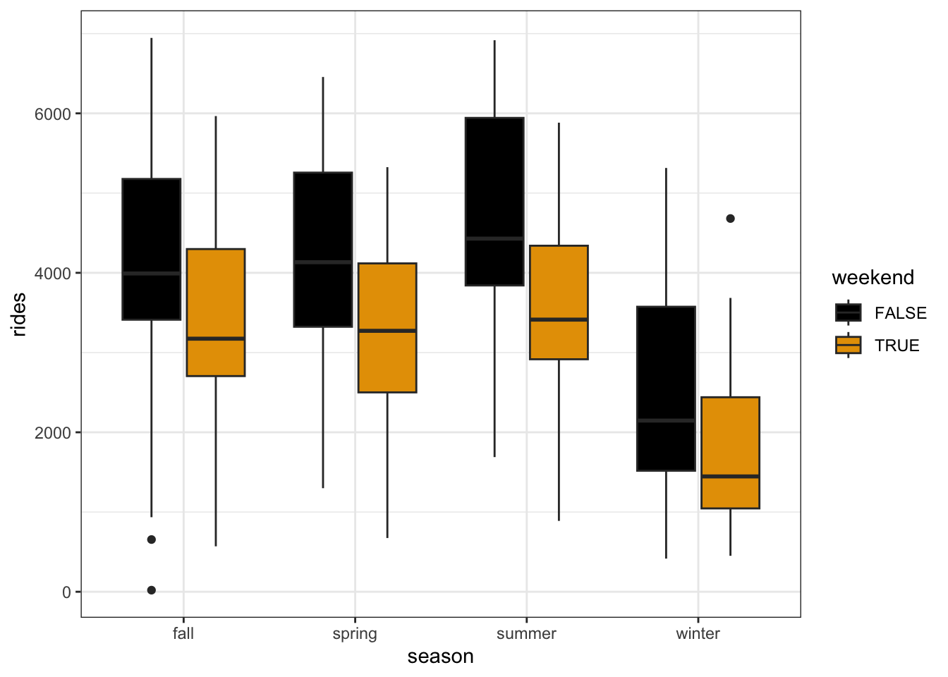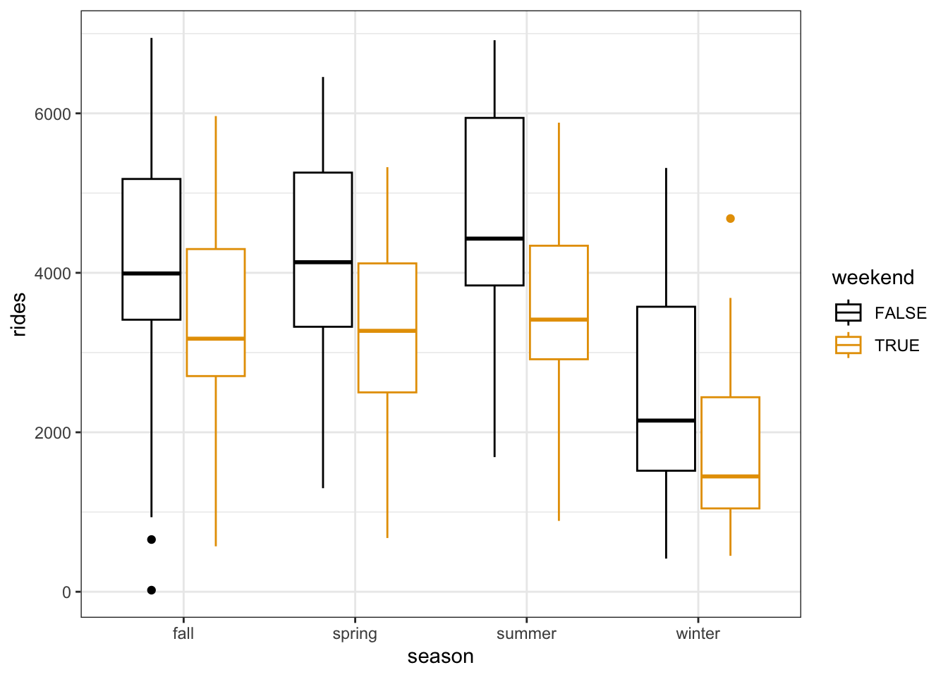 Let’s explore the relationship of rides with 2 categorical predictors, weekend status and season. The below code plots rides vs just season. Modify this code to also include information about weekend. HINT: Remember the visualization principle that additional categorical predictors require some sort of grouping mechanism that distinguishes between the groups.