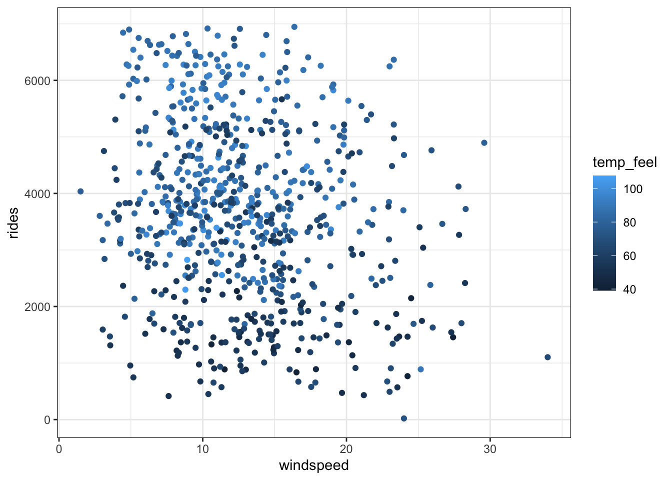 Ridership tends to increase with temperature (no matter the windspeed) and decrease with windspeed (no matter the temperature). The relationship is pretty strong. There’s one possible outlier on a day with high temperature and high windspeed, but relatively few rides.