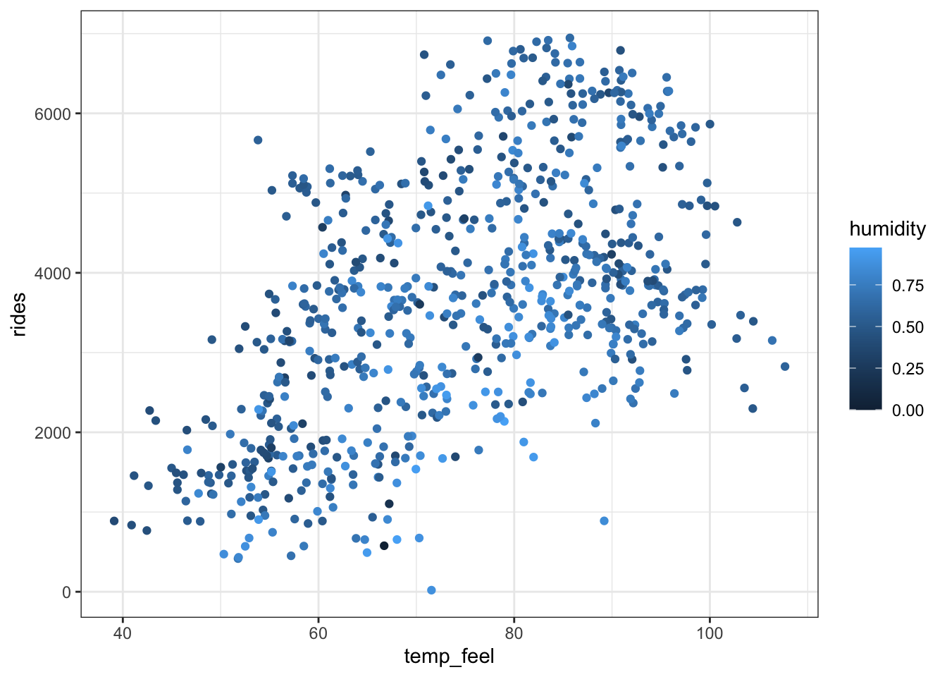 ggplot(aes(y = rides, x = temp_feel, color = humidity)) +