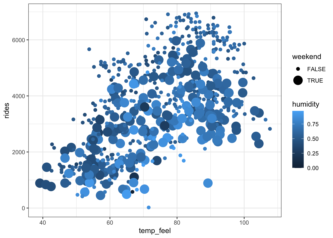 ggplot(aes(y = rides, x = temp_feel, color = humidity, size = weekend)) +