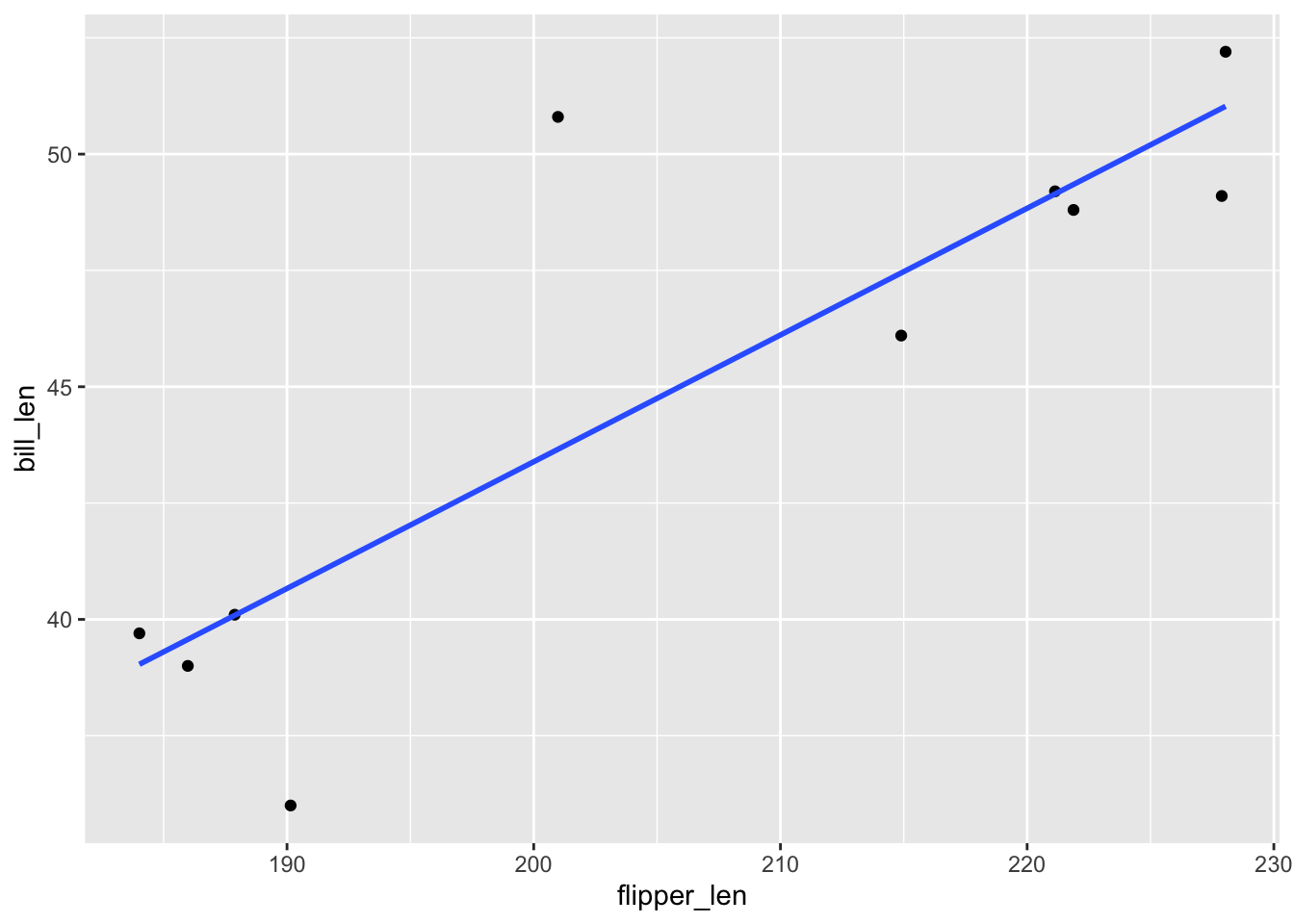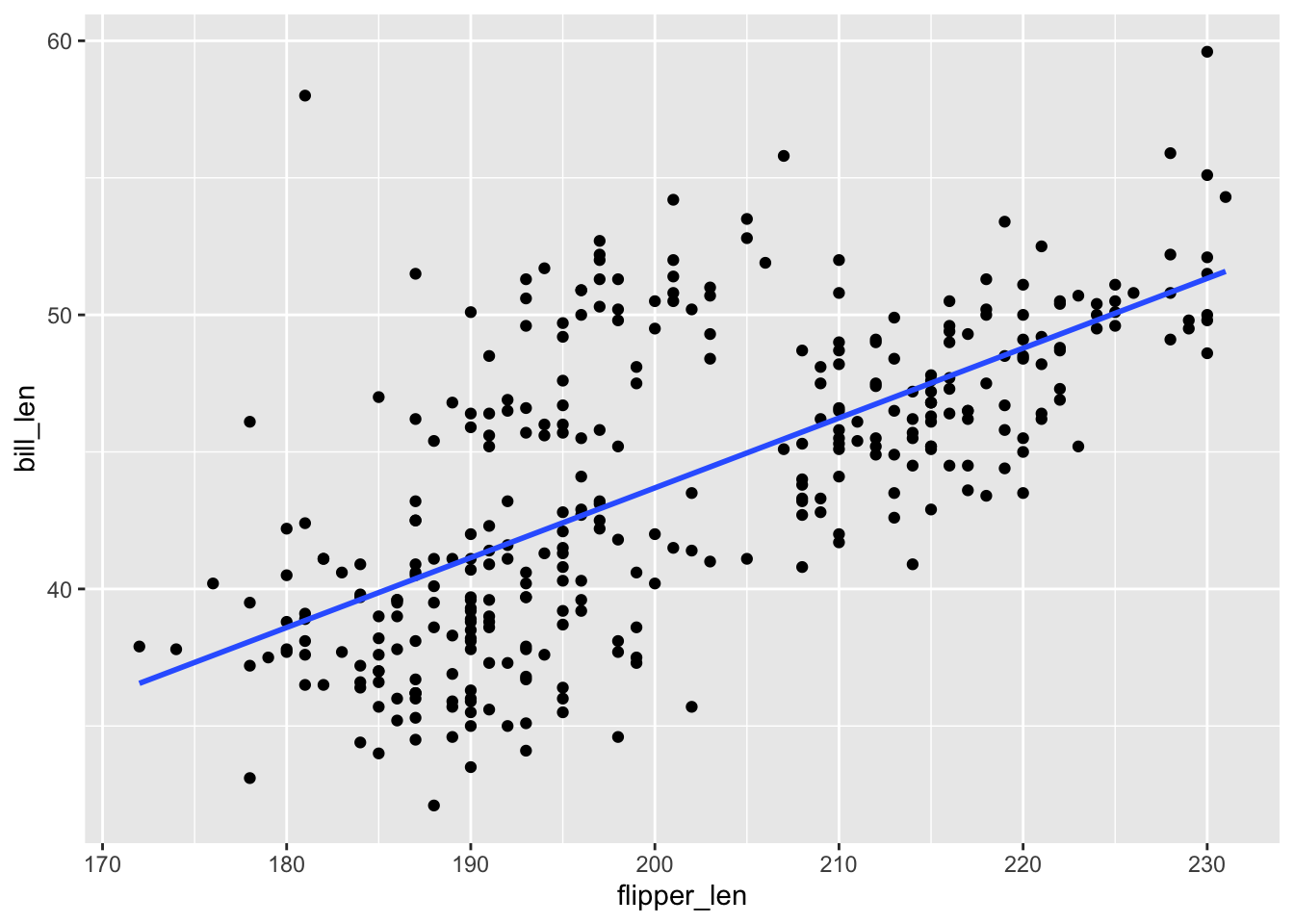 geom_smooth(method = "lm", se = FALSE)# Plot penguin_model_2