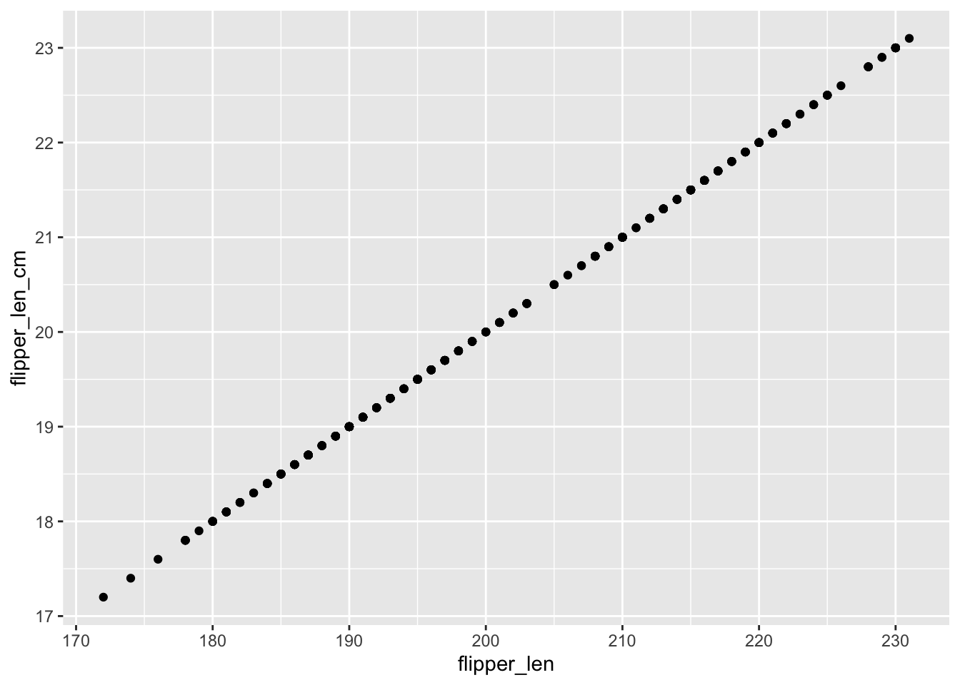 ggplot(penguins, aes(x = flipper_len, y = flipper_len_cm)) +