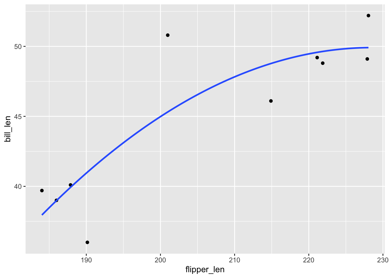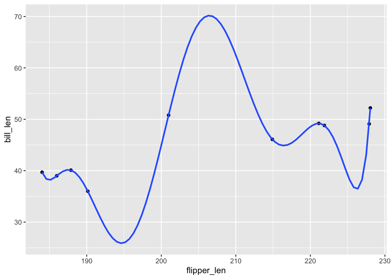geom_smooth(method = "lm", formula = y ~ poly(x, 9), se = FALSE, data = penguins_small) +
