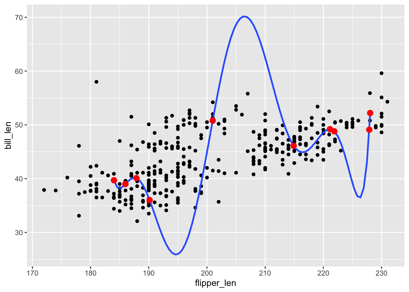 poly_mod_9 <- lm(bill_len ~ poly(flipper_len, 9), penguins_small)- A gut check! Answers will vary