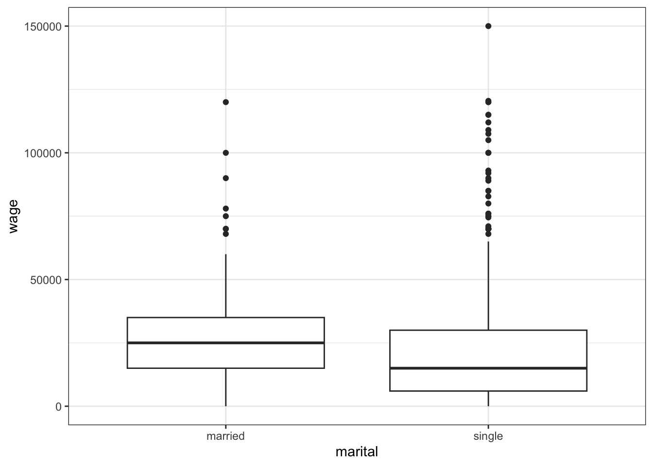\[ E(wage | marital) = \hat{\beta}_0 + \hat{\beta}_1 maritalsingle = 27399.47 - 6596.13 maritalsingle \]