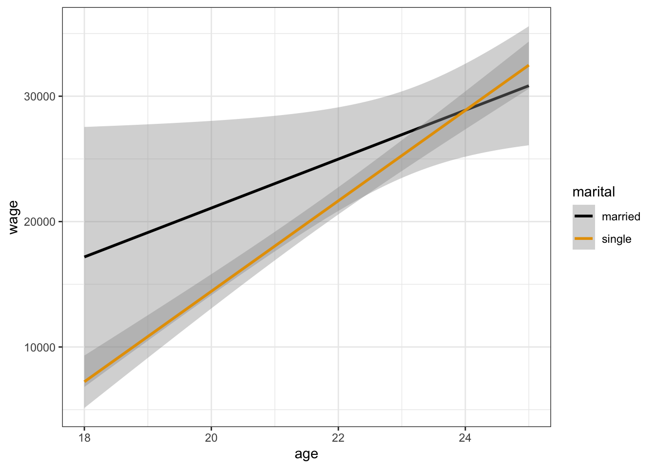 Understand the population model of wages by marital status among 18-25 year-old workers: