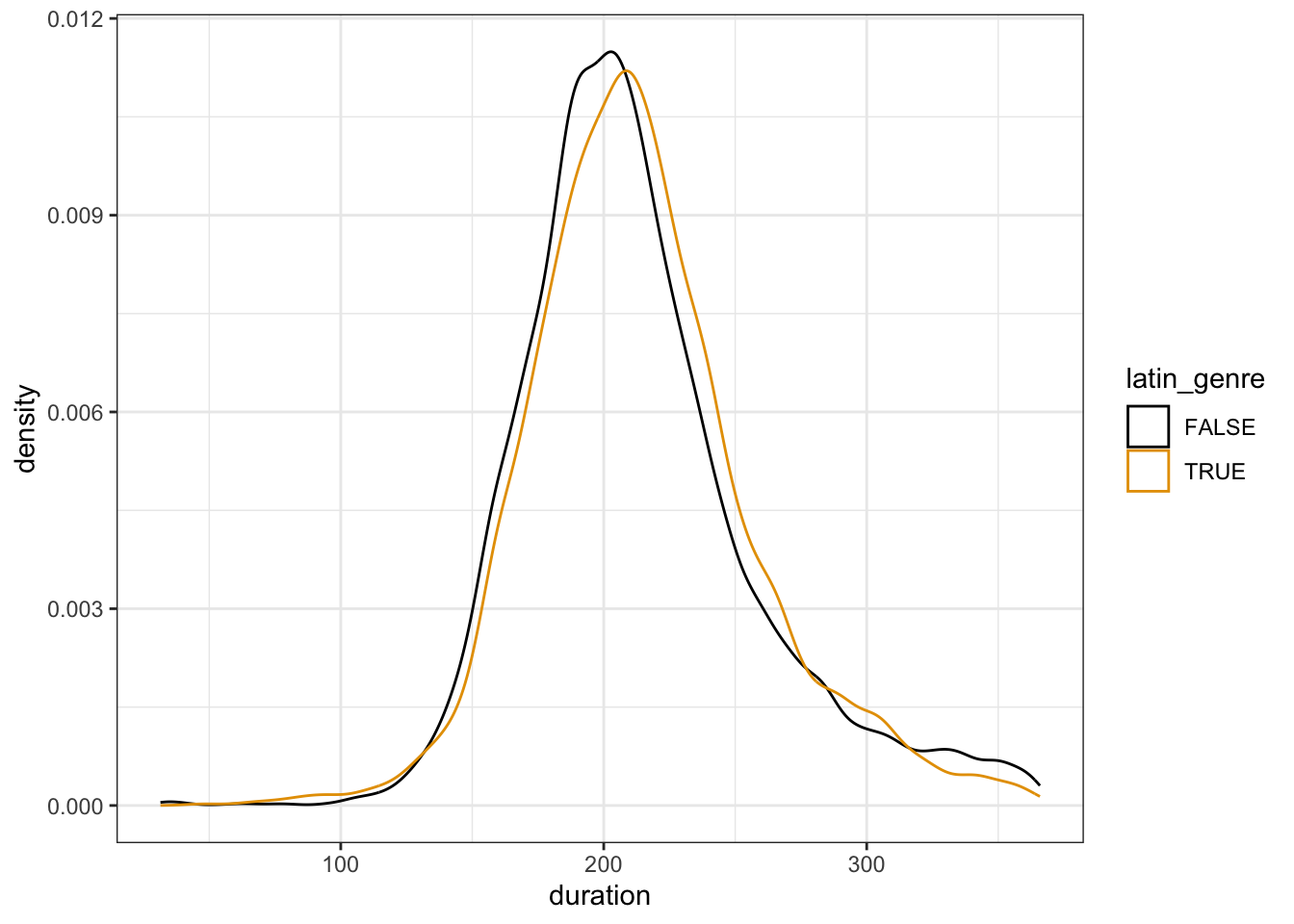 # Build the modelspotify_model_2 <-lm(duration ~ latin_genre, spotify_big)coef(summary(spotify_model_2))## Estimate Std. Error t value Pr(>|t|)## (Intercept) 212.673908 0.4165491 510.56143 0.00000000## latin_genreTRUE 1.555355 0.7435700 2.09174 0.03647731